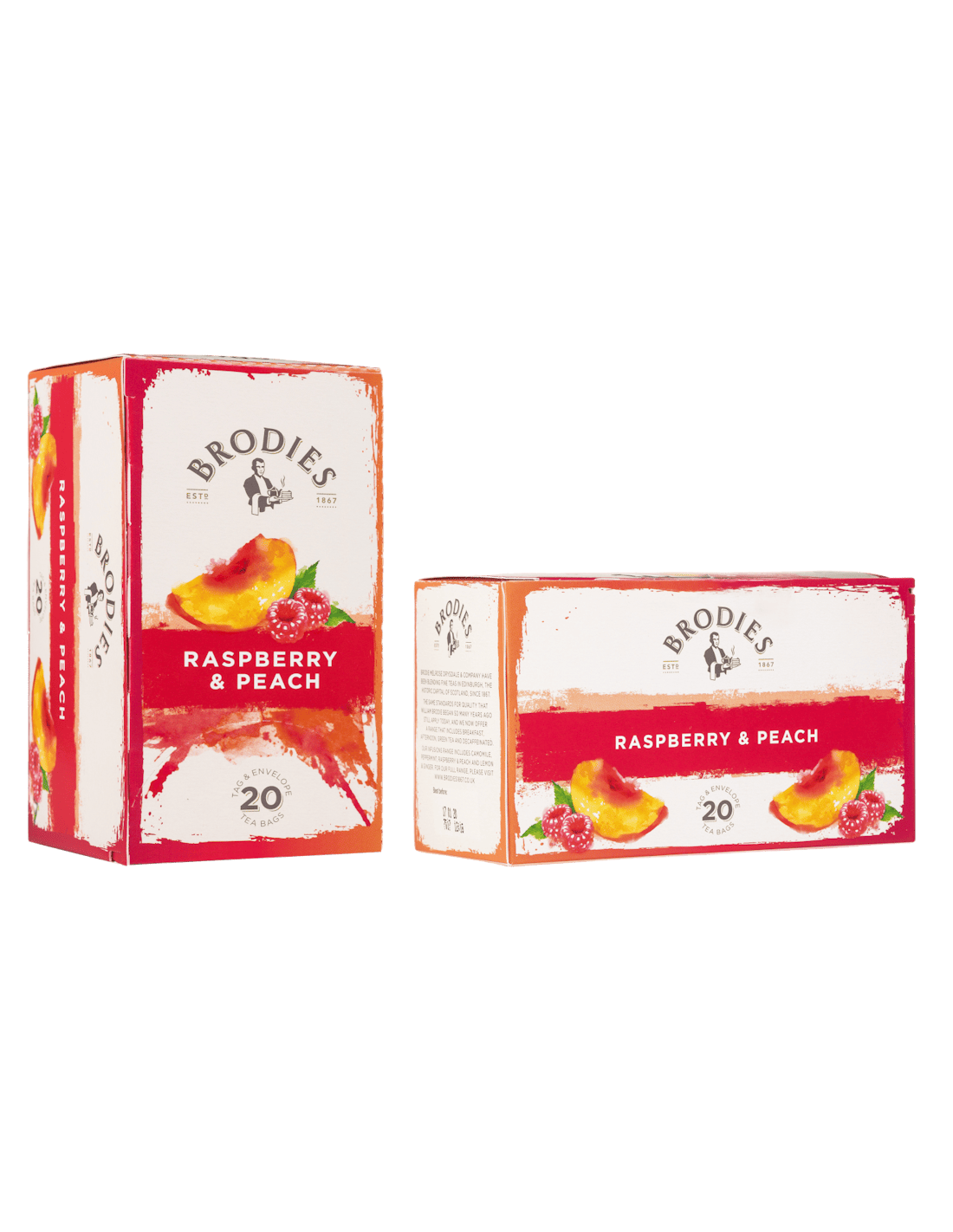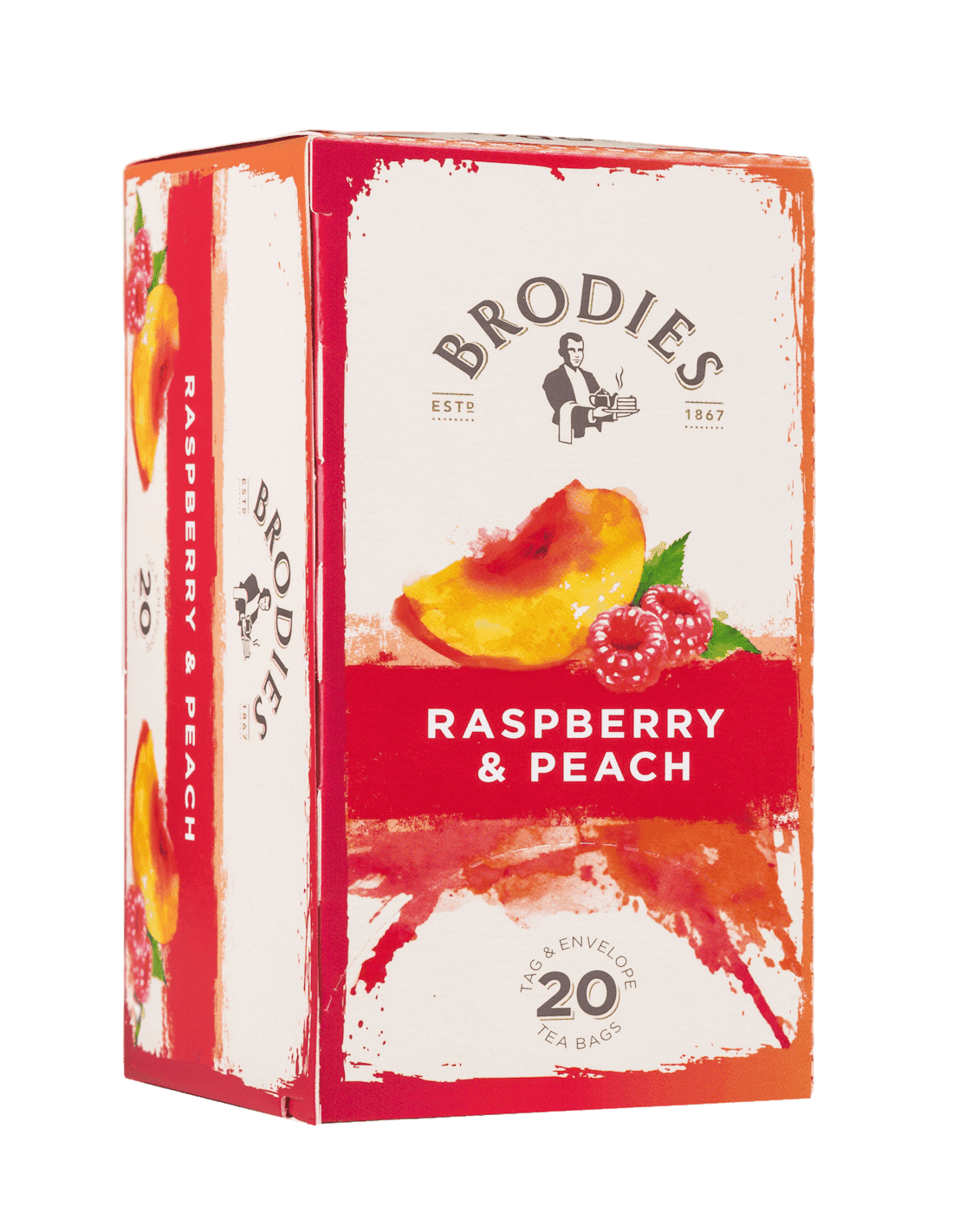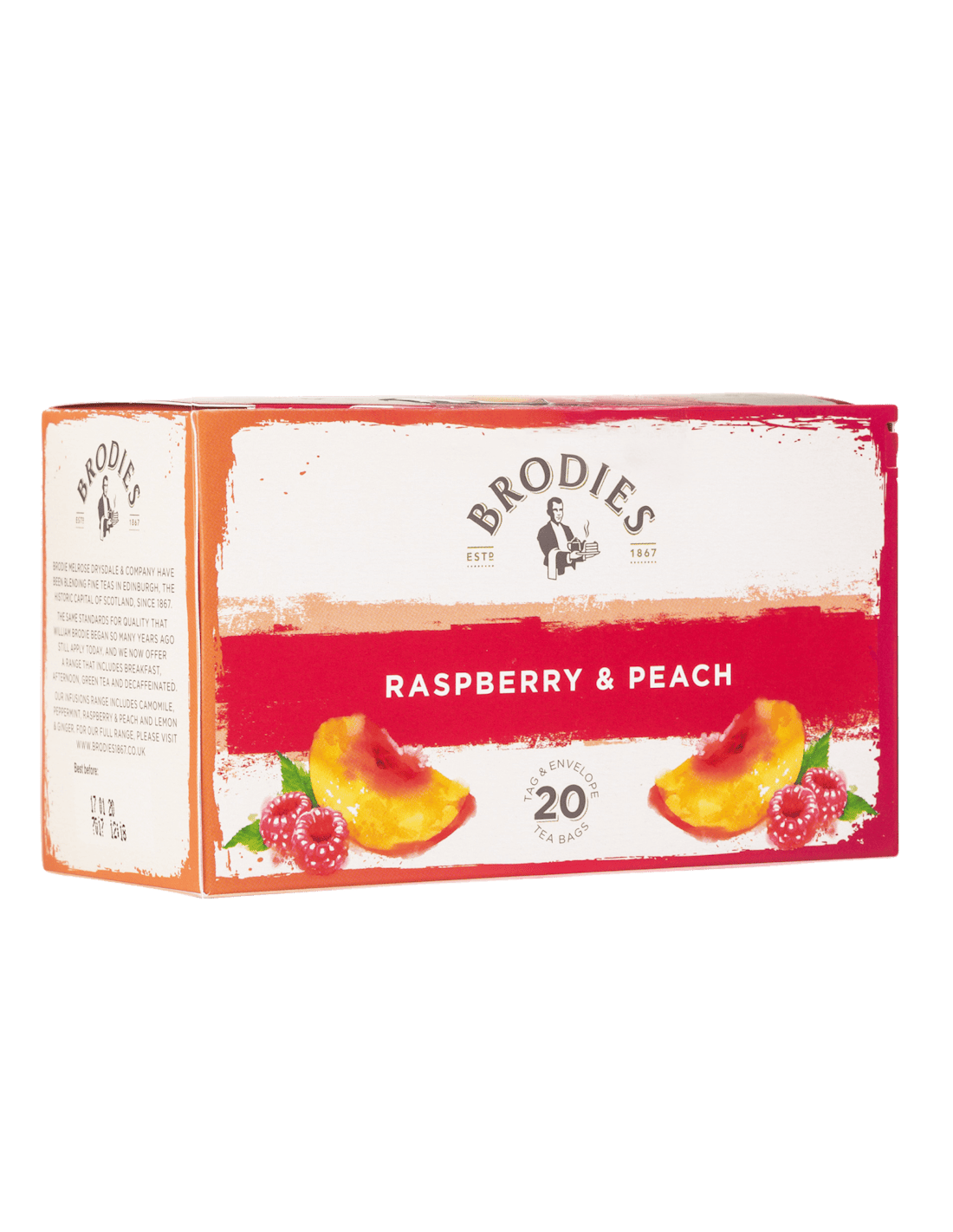 Desde há mais de 150 anos, a Brodies seleciona as melhores qualidades em folhas para criar uma ampla oferta das mais apreciadas variedades de chá e infusões. Infusão em que sobressai a frescura da framboesa e a doçura do pêssego.