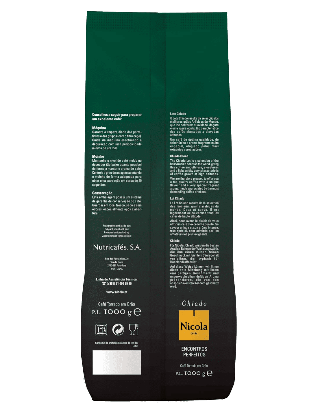 O Lote Nicola Chiado (1kg) resulta da seleção dos melhores grãos Arábicas do Mundo, que lhe conferem suavidade, doçura e uma ligeira acidez tão característica dos cafés plantados a elevadas altitudes. Um café de ótima qualidade, de sabor único e aroma fragrante muito especial, elogiado pelos mais exigentes apreciadores.
