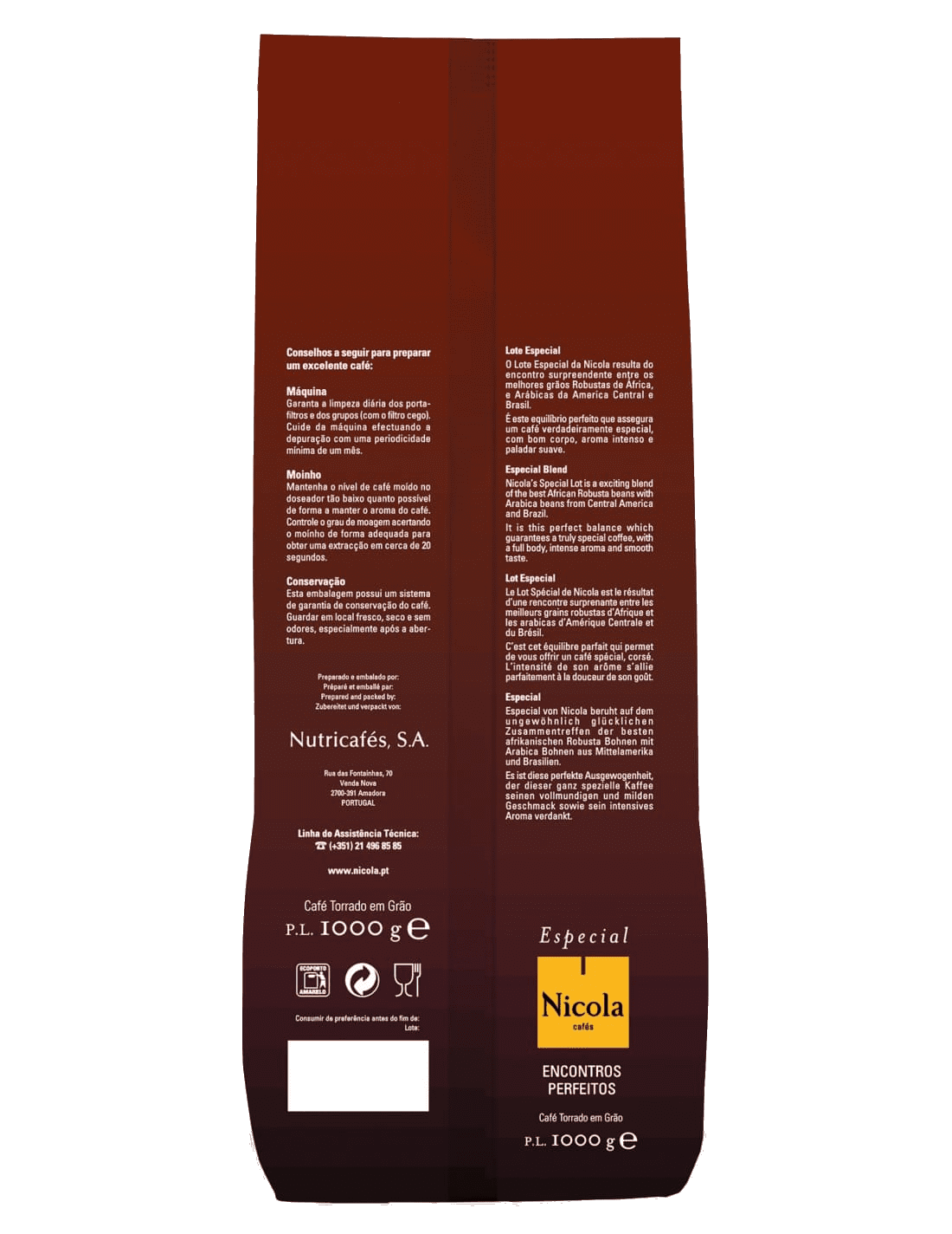 O Lote Nicola Especial (1kg) resulta do encontro surpreendente entre os melhores grãos Robustas de África, e Arábicas da América Centrale Brasil. É este equilíbrio perfeito que assegura um café verdadeiramente especial, com bom corpo, aroma intenso e paladar suave.